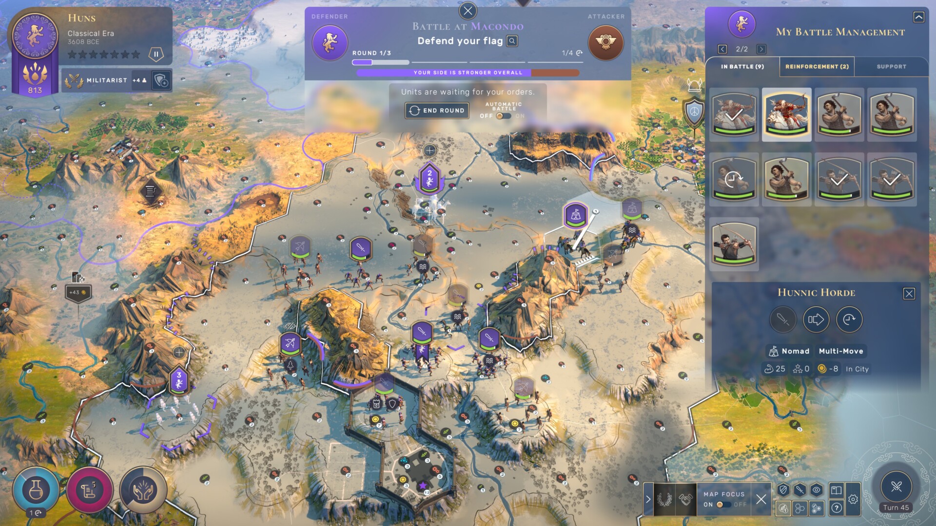 You also have to take note of elevation and terrain bonuses/penalties. If possible, you should maneuver armies to a hex with a higher vantage point prior to engaging in a fight. This will allow you to deploy with the high ground. Likewise, you can bring additional reinforcements that are near the vicinity of a battle that’s taking place (provided that you’ve researched the “Organized Warfare” tech). Click on the “+” button to choose a unit that you can spawn on a free tile.