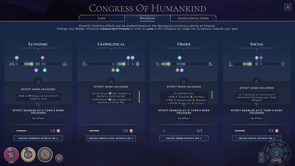 In your own civics alignment, the effects come from your decisions and will only affect your nation. For the Congress doctrines, though, the results are dependent on how each empire has charted its own course throughout the game (i.e., more empires preferred Homeland instead of World). Depending on how far a segment is along an axis, all empires will gain the effect, whether or not they’re following that ideology, to begin with.