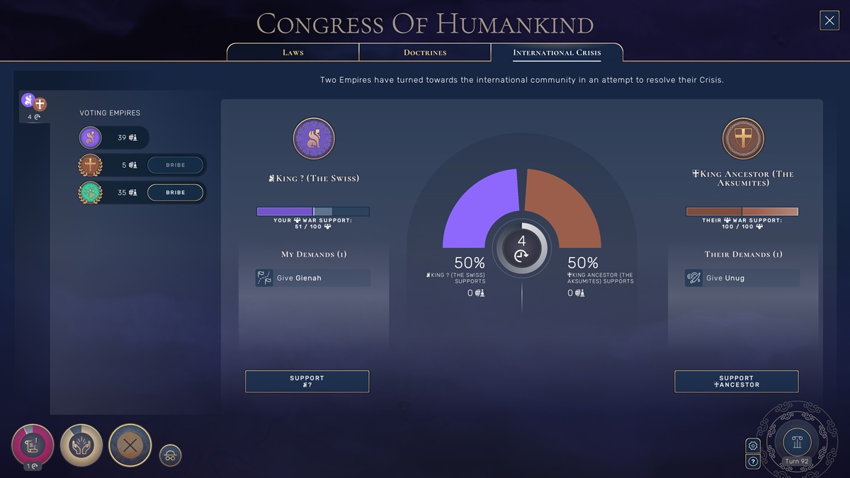 Last but not least, the Congress of Humankind is able to participate during an international crisis. For instance, if you press your demands, you have the option to put it to a vote. If it passes, the target will have to accede, or war will be declared. Similar to laws, you have the option of bribing other nations to sway them to your side.