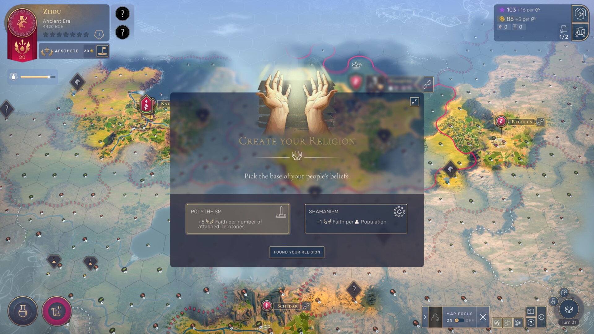 Starting the religion game in Humankind occurs once your city has 10 population. You’ll receive a prompt about founding a religion. You have two options: