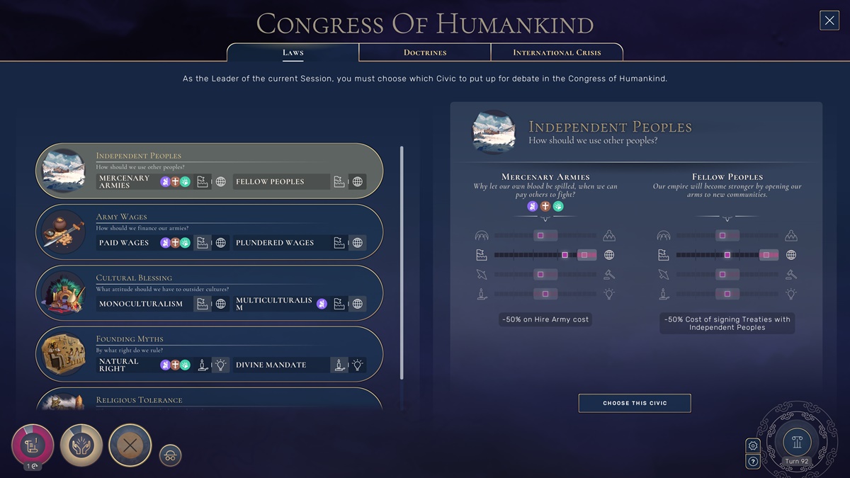 Lastly, the Congress of Humankind is akin to the United Nations/World Congress in Civilization or the Galactic Senate in Stellaris. Each member empire is able to vote on resolutions/laws, choose doctrines, or partake in an international crisis. The last one is fairly important, as it can lead to mishaps if you click on the wrong buttons. For example, if you’ve defeated a rival in a war, several grievances might pop up. If you enforce these demands, put them up for a vote, and subsequently lose that vote, then you’d be embroiled in a war again.