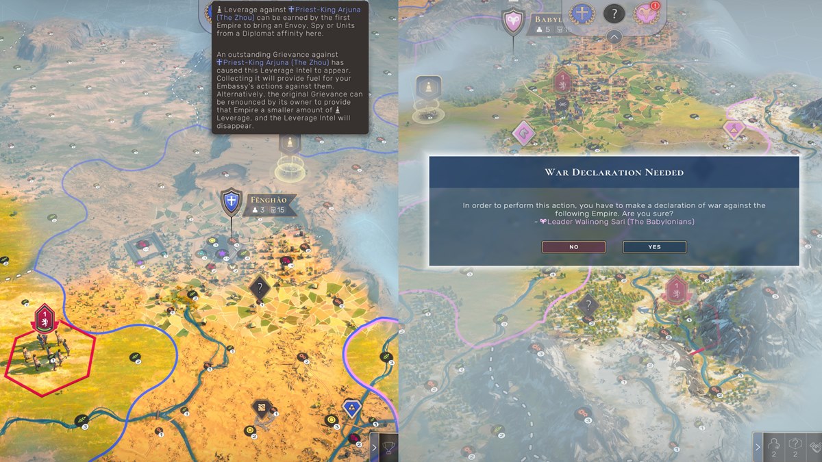 On the same panel, you’ll see more actions that cost Leverage. These are generated by grievances or mishaps between two empires. Similar to curiosities, you can collect these little pawn icons on the map using your agents (more on these units later). You may decide to expel an army from your territories, reveal undercover assets, and placate your rival to lower their war support. In essence, you’ll have more tools at your disposal if you want to manipulate your opponent’s moves.