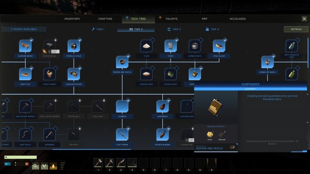 - The gunpowder and steel bloom recipes can be unlocked by spending a point each after obtaining the Mortar and Pestle blueprint.