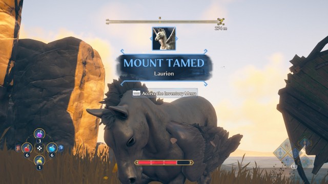 As you can see, Laurion is located around the very North-Eastern tip of the bottommost part of Clashing Rocks. Take a closer look at the featured image if you’re having trouble spotting the exact location. If you haven’t tamed a mount yet, it couldn’t be simpler. Simply crouch and approach them very slowly. If you move too quickly, they’ll run off. If you’re having trouble at first, just save your game nearby and, if Laurion runs off and despawns, simply re-load your save and he’ll be back where he was. You just need to make your way up to them without scaring them and then press the interaction button. Shortly after, Laurion will be all yours and you can start riding them immediately. Equipping them on the inventory screen will let you summon them at any time by holding down the interact button.