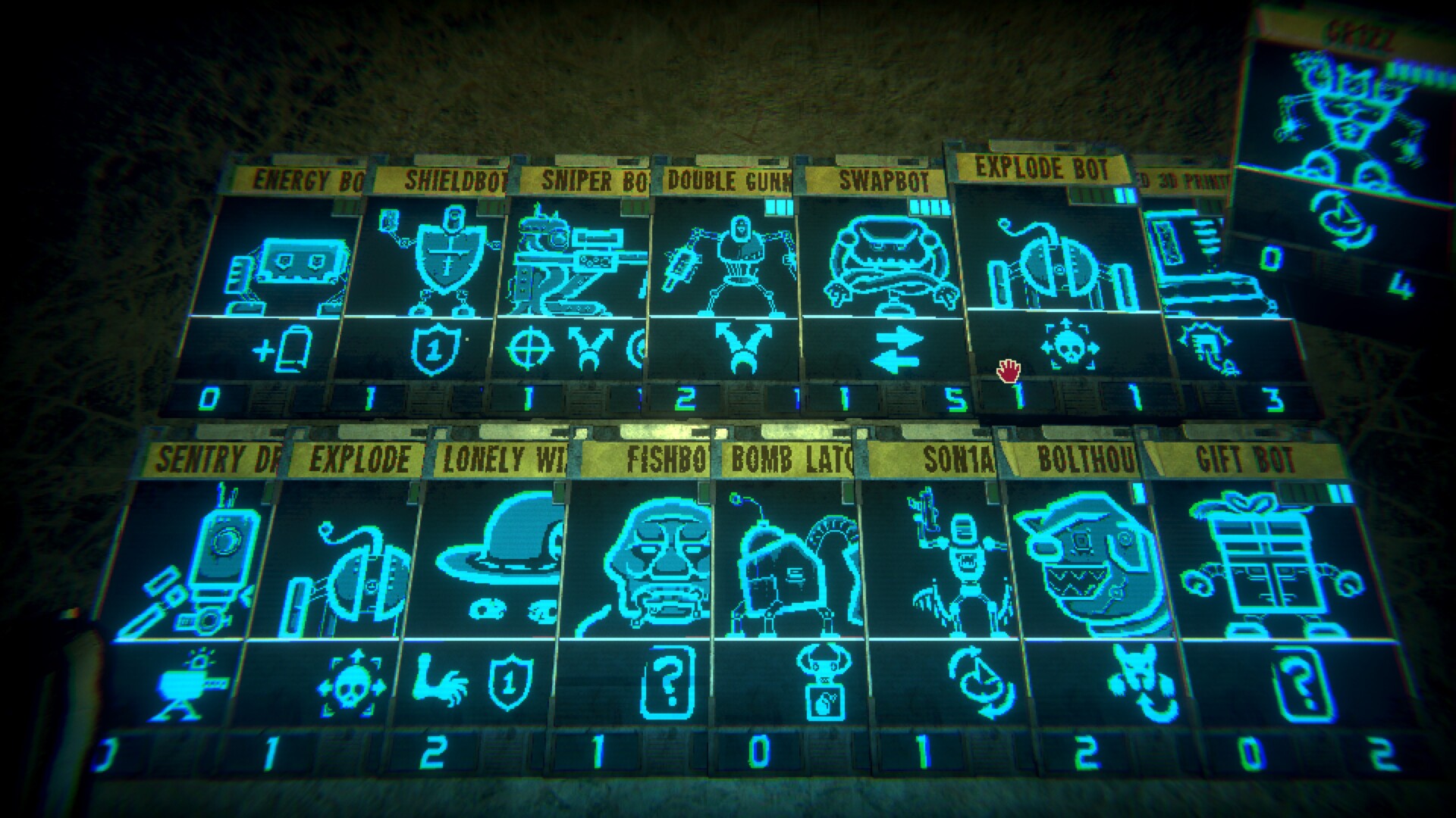 Given that this is P03’s playground, your cards are actually robot versions of some of the ones you’ve seen before. As for upgrades and acquisition, you’ll see icons of objects that you can interact with. Examples include: