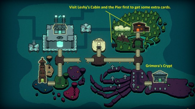 When you exit the altar area in Act 2 of Inscryption, you’ll see a world map. The bridge to the left hasn’t been repaired yet, but we’ll go back there later. For now, we can only battle Leshy or Grimora, and we’re going to take out the latter. Grimora’s Crypt is at the bottom-right corner of the map. Before you go there, though, you’ll want to visit a couple of locations: