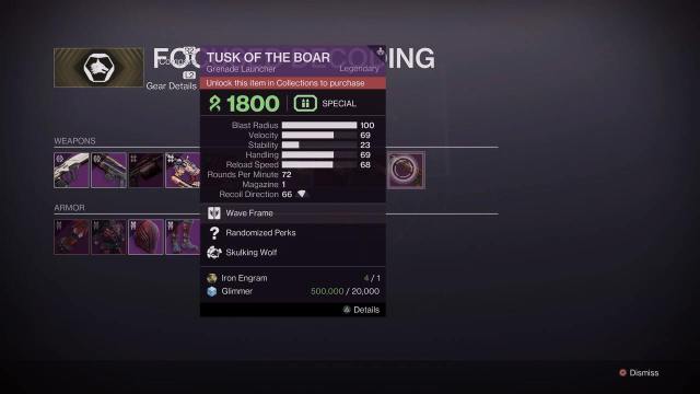 Tusk of the Boar is only available through Iron Banner. It has a chance to drop randomly, and I’ve heard from players online that there’s about a six percent chance of it dropping. That said, once you do acquire a Tusk of the Boar, you can use Iron Banner Engrams to focus Tusk of the Boar. It costs one Iron Banner Engram and 20,000 Glimmer, but it’s worth it for a God Roll.