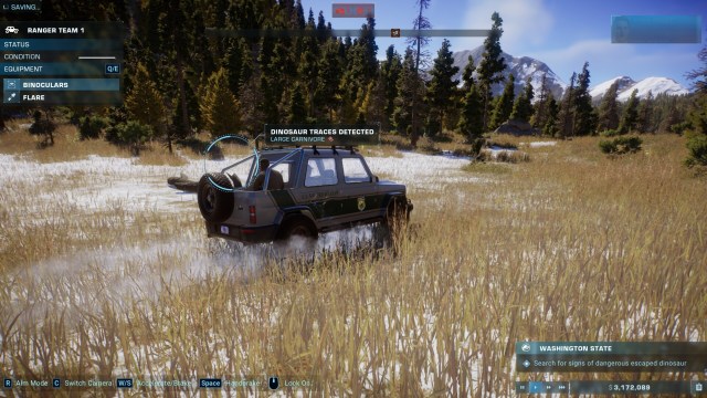 The second mission in Jurassic World Evolution 2‘s campaign takes place in Washington. After the intro, you’re told to repair the ruined enclosures or construct new ones for the two Carnotaurus that are rampaging near the base. Then, a new objective pops up. It tells you to directly control a ranger van and drive it down the forest path. Along the way, you’ll find several markings that you can scan. Eventually, you’ll stumble upon the Allosaurus. Go shoot it with tranquilizers and bring it back to base.