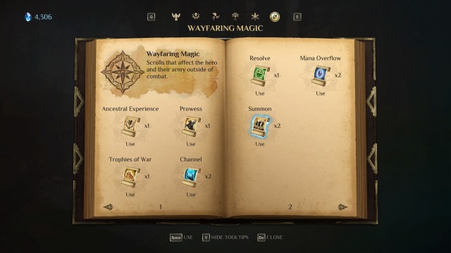 - Wayfaring Magic – Unlike the previous categories, Wayfaring Magic refers to scrolls that can be used outside of battle to confer boons to your hero or units. Examples include gaining additional XP, a morale boost for units, and even a summon that adds units to your roster. Some effects (i.e., summons) are instant while others are temporary.