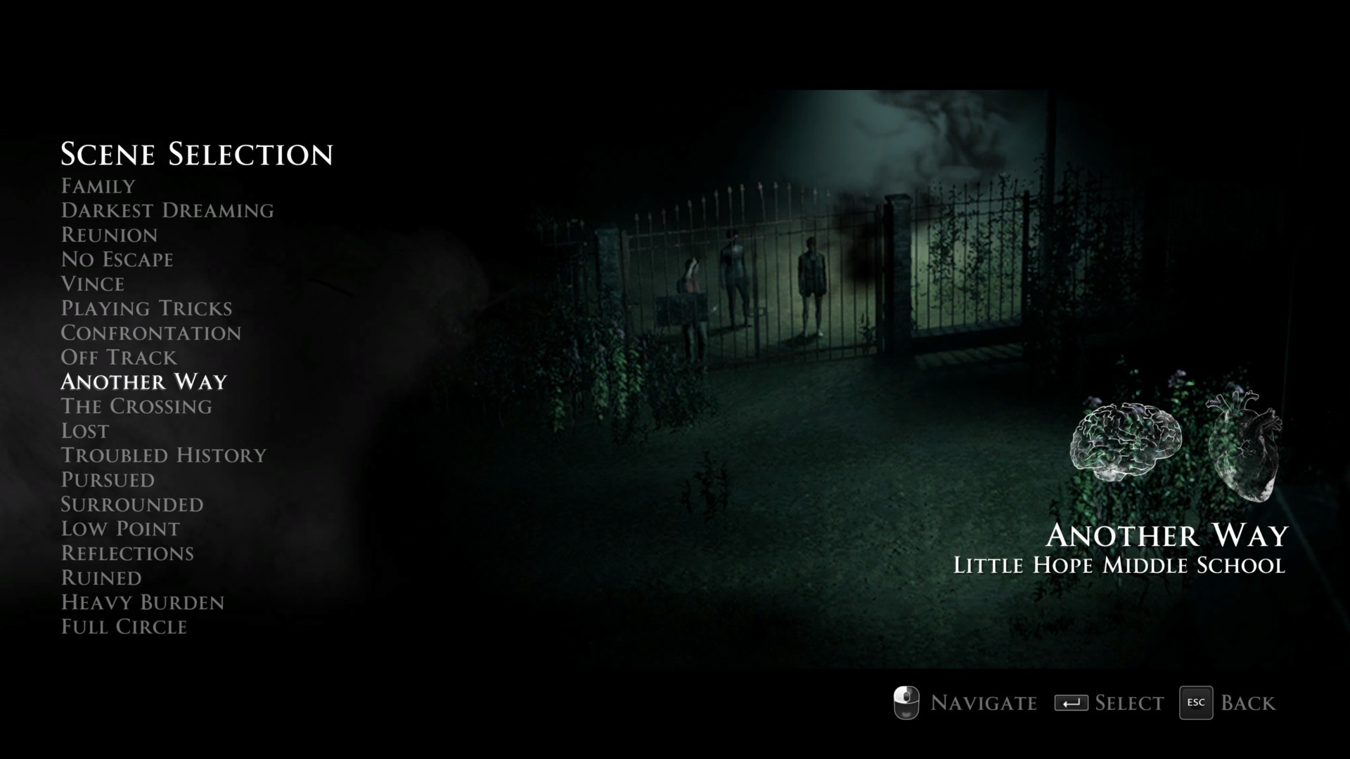 Lastly, scene selection becomes available whenever you complete chapters in the game (the previous one becomes unlocked). This lets you make different choices which could lead to new outcomes.