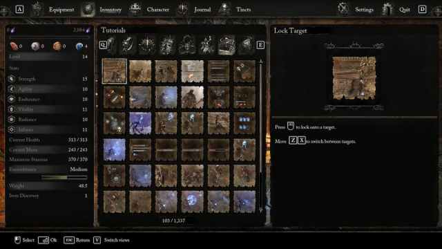 Open the ‘pause’ menu, go into your inventory, and keep scrolling through the tabs until you’ve hit the tutorial section. Typically, Soulslike games do not do this, and some, like Elden Ring, have their tutorials hidden away. This feature is fantastic for newer players to get acquainted with the many mechanics of the game.