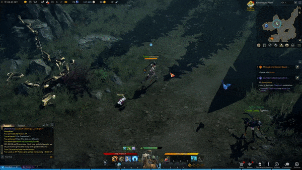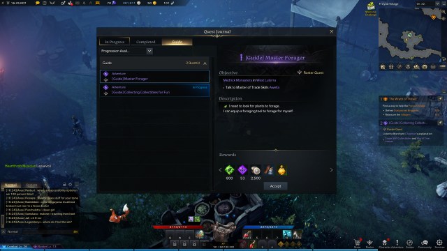 After Thirain learns the people of Freyad Village are starving, he asks you to help. This triggers the Guide Quest for you to learn the Foraging Life Skill. Click on the orange button that appears to accept it. Follow the purple quest markers to find Awella and learn how to Forage. This one is very straightforward. Like ore, you will be able to see plants you can harvest on the map and mini-map.