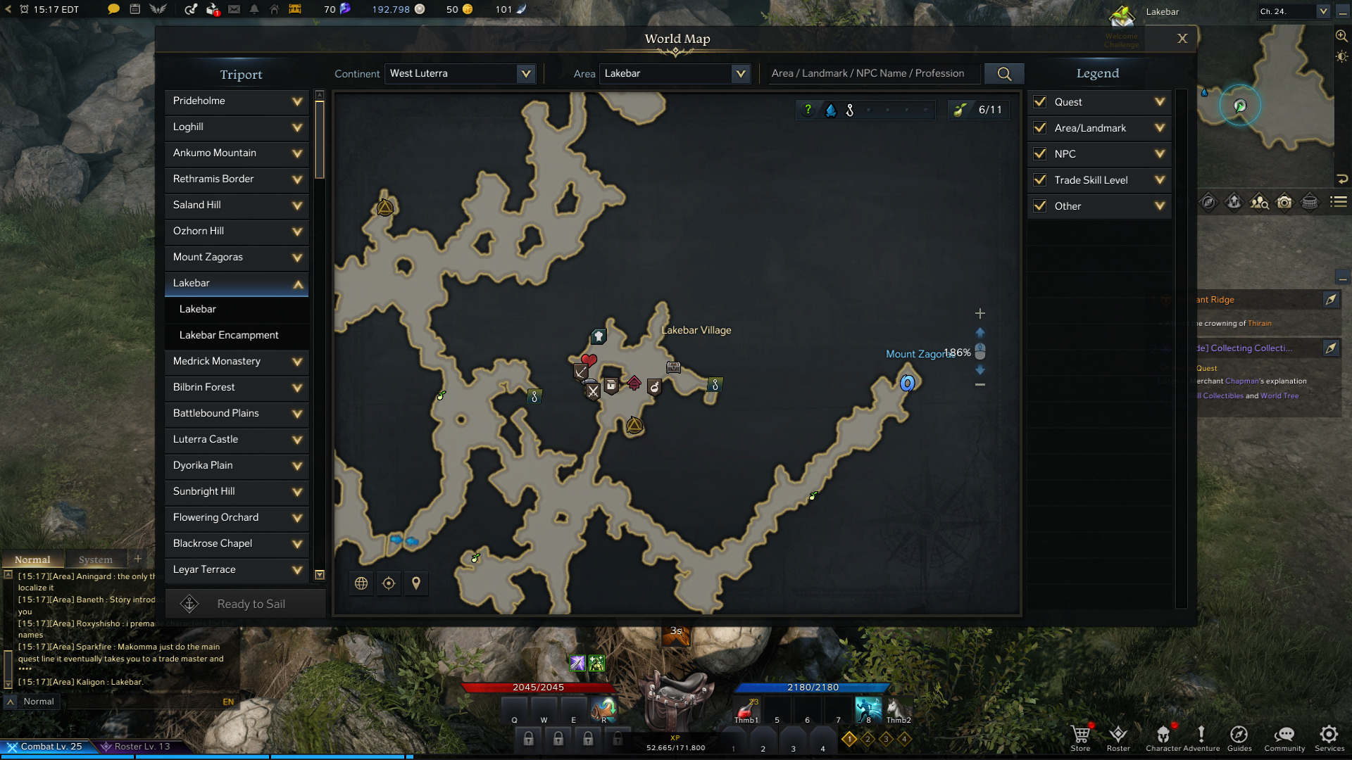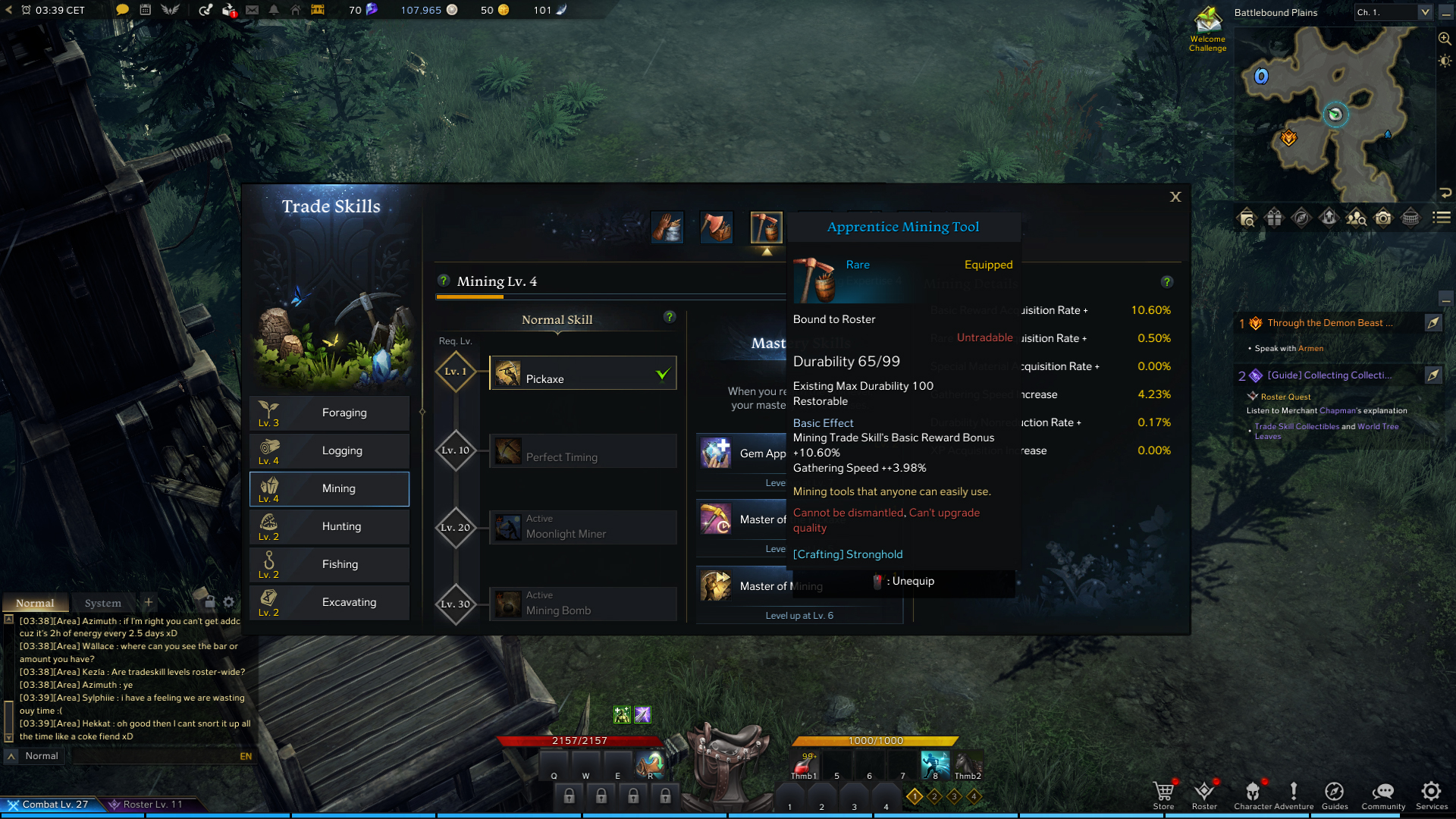 The first skill you unlock is Mining. This is done in Lakebar Village when you need to gather ore to make a crown for Thirain. An orange pop-up will appear in the center of your screen to activate the Mining Guide Quest. Accepting it sends you to the Trade Skills Guildmate, who will give you a brief rundown for Mining. She’ll then direct you to the vendor to purchase a pickaxe. Grab that, and then head out of the village to find some ore. You’ll be able to see it on the map or mini-map as a blue lump of rock. Find an ore node, press ‘G’ to mine, and you’ll get your materials.