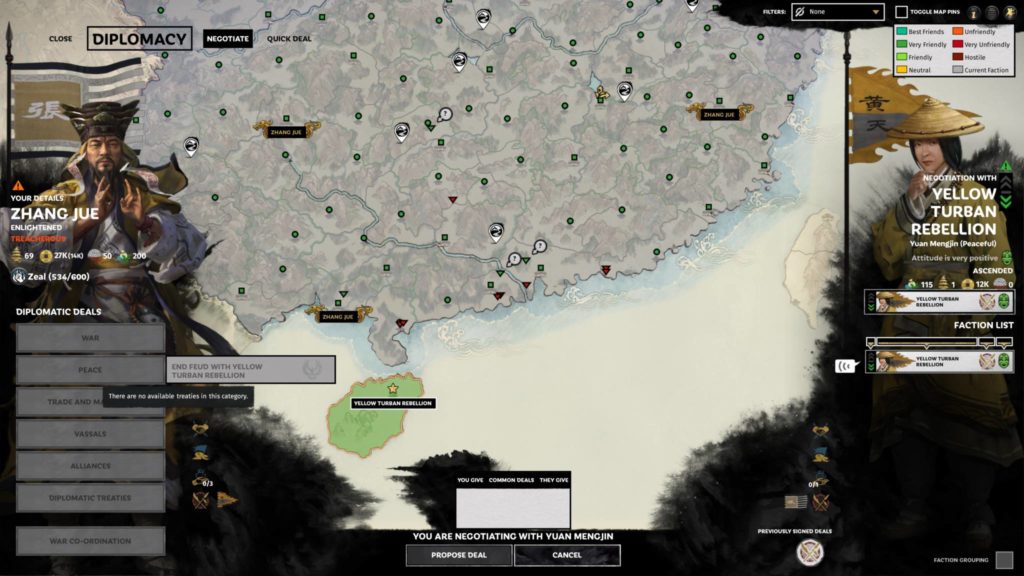 - Next, I vassalized everyone by giving them lands, gold, and ancillaries. The only exception was the NPC Yellow Turban faction since they’ll never accept.