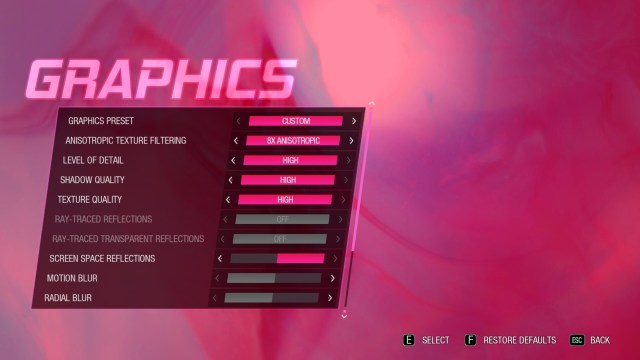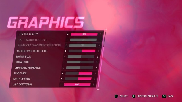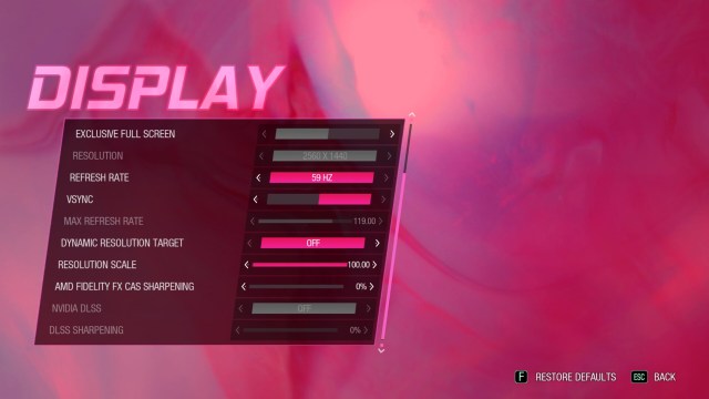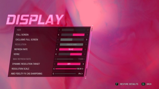 As you can see, this comes with support for multiple refresh rates, dynamic resolution, CAS sharpening, and DLSS. I couldn’t test the DLSS because I have an AMD card. It’s also the bane of my existence, so there’s that. I had the game set at 120 fps even though I never got anywhere near that. Probably should have gone for HDR instead. Oops. Also, the game pauses when you alt-tab. Not freezes, but it literally goes to the pause screen immediately. Here are the graphics options.