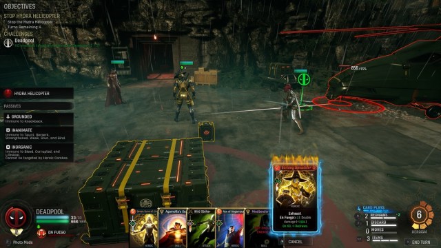Given the above, a few things are made clear. First, it’s that Deadpool’s DPS is quite underwhelming (barring a few cards like Burning Sensation with high En Fuego levels). He really needs his teammates to take out hostiles, preferably with All Together Now active. Otherwise, he’ll lag behind due to not having any boosts. Second, it’s that he must avoid taking hits or he’ll lose an En Fuego stack.