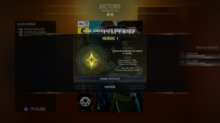 Eventually, progressing further in the game and earning higher star ratings will also unlock new difficulty modes which you can switch to whenever you’re not in combat. These options, Heroic and Ultimate, have three tiers each. At Ultimate III, you’ll receive +40% XP and +175% Gloss. However, this will also significantly increase enemy health, damage, and reinforcement waves, while preventing you from reviving any of your characters.