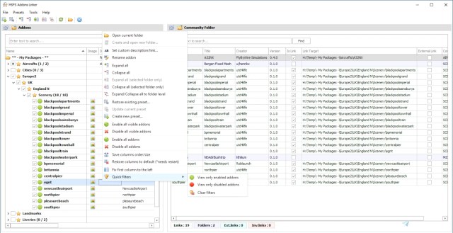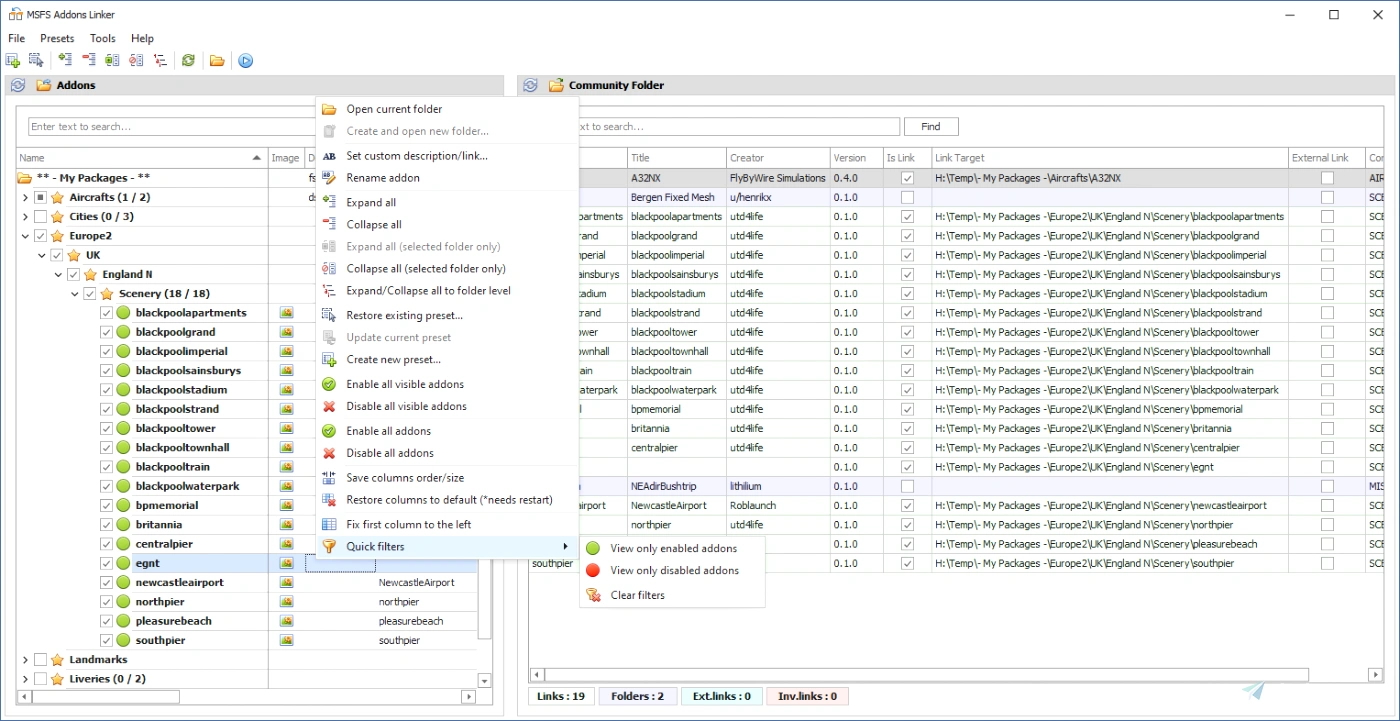 Microsoft Flight Simulator Addon Linker can neatly display such a layout and goes as far as to let you enable and disable specific add-ons with the click of a button. The utility then displays what add-ons are currently enabled and sitting in the community folder, along with relevant details like the version number, add-on creator, etc. It has other powerful features like being able to enable/disable an entire subfolder at once, a search tool, save the current selection of enabled/disabled add-ons (and restore that selection), as well as create and manage presets. Additionally, MSFS Addon Linker can make the startup of the sim a little faster by skipping the opening animation. It can also launch any external programs you’d want to run alongside the sim. Clearly, this is a very powerful tool!