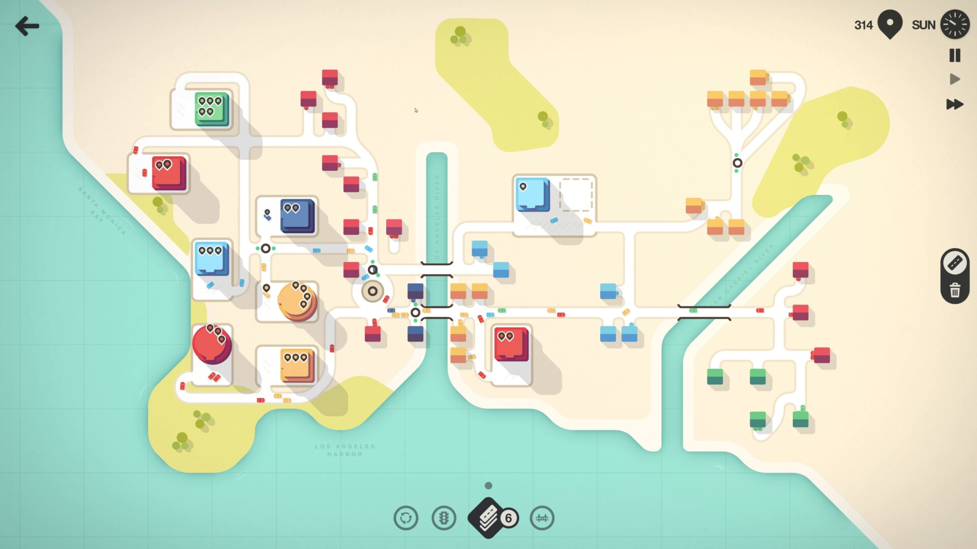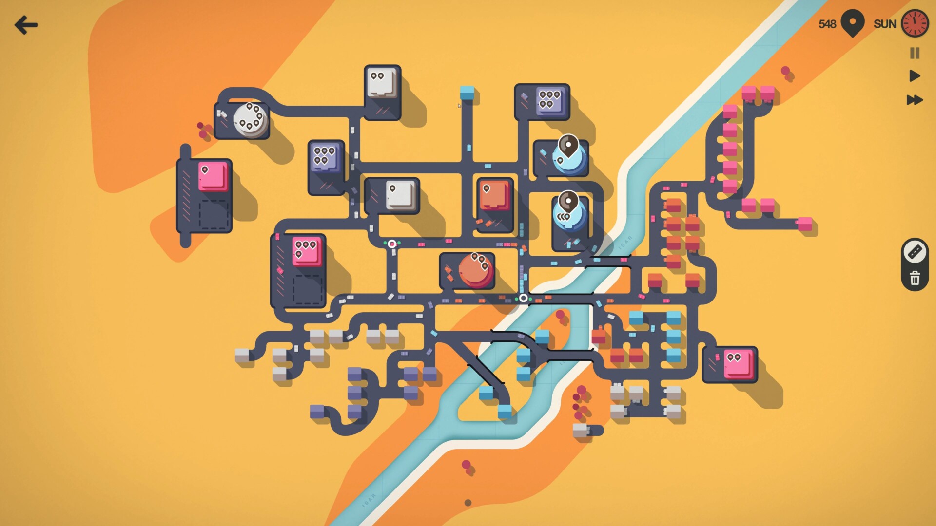 Early on in a Mini Motorways playthrough, the moment-to-moment action progressed at a fairly glacial pace. I found myself actually using the fast-forward option rather liberally for the first couple of weeks on any map. It doesn’t take long before things start to pop off at a rate that can be rather hard to keep up with, however. Essentially, there will be an audio queue that hits, signifying new businesses and/or garages have appeared. It’s up to you to actually track them down because very little is done to draw attention to the rapidly repopulating structures. It doesn’t take long for the early malaise to devolve into a pausing frenzy in an attempt to stay atop the constant changes to your urban footprint.