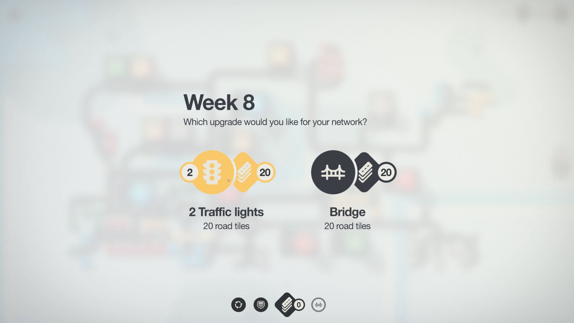 In the top-right corner of the HUD there’s a clock that acts as a timer, counting down to your weekly resource refill. Every Sunday, you’re given the choice between a couple of different item bundles, usually in the form of a combination of road pieces, and either a bridge, roundabout, highway, or tunnel. I found myself usually opting for whichever dealt me more pavement pieces, because I continuously felt as though I was always short on the resources necessary to scale my municipality’s commuter options.