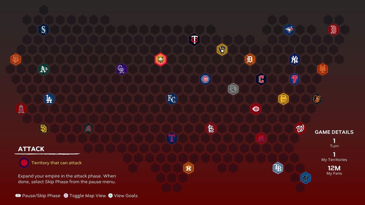 Conquest was a particularly fun mode that was triggering my inner Napoleonic complex. You’re set in a 2D map to spread your fandom across the entirety of the United States, opposing home teams be damned. You will move your fanbase like you would play a game of checkers or chess, spreading your influence and battling opposing teams in the hope of becoming the most popular team in the country. While you can choose to play or simulate some games, the real strategy is knowing how to move across the map, how to redistribute your fanbase to cover new grounds, and even finding the occasional hidden rewards, which in turn will strengthen your team further. It’s like Risk but with baseball.
