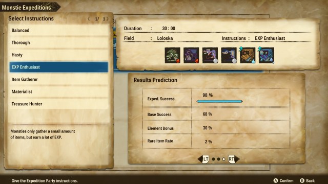 - Monsties – You can pick up to six creatures to join the expedition as long as they’re not members of your active party. The higher their levels, the better the chance of success. In a few cases, there might be additional modifiers in play (i.e., Loloska favors creatures who have water or ice elemental bonuses).