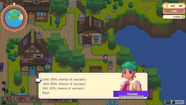 In total, there are 11 romance options to choose from. 10 of them live in the town, while the last one is the Magic Man you stumble upon while exploring islands. Every day, you have the chance to speak with each NPC three times. You can Chat, Joke, or Flirt. Each choice has a chance of success, which can change as you start to become closer to them and upgrade your skill tree.