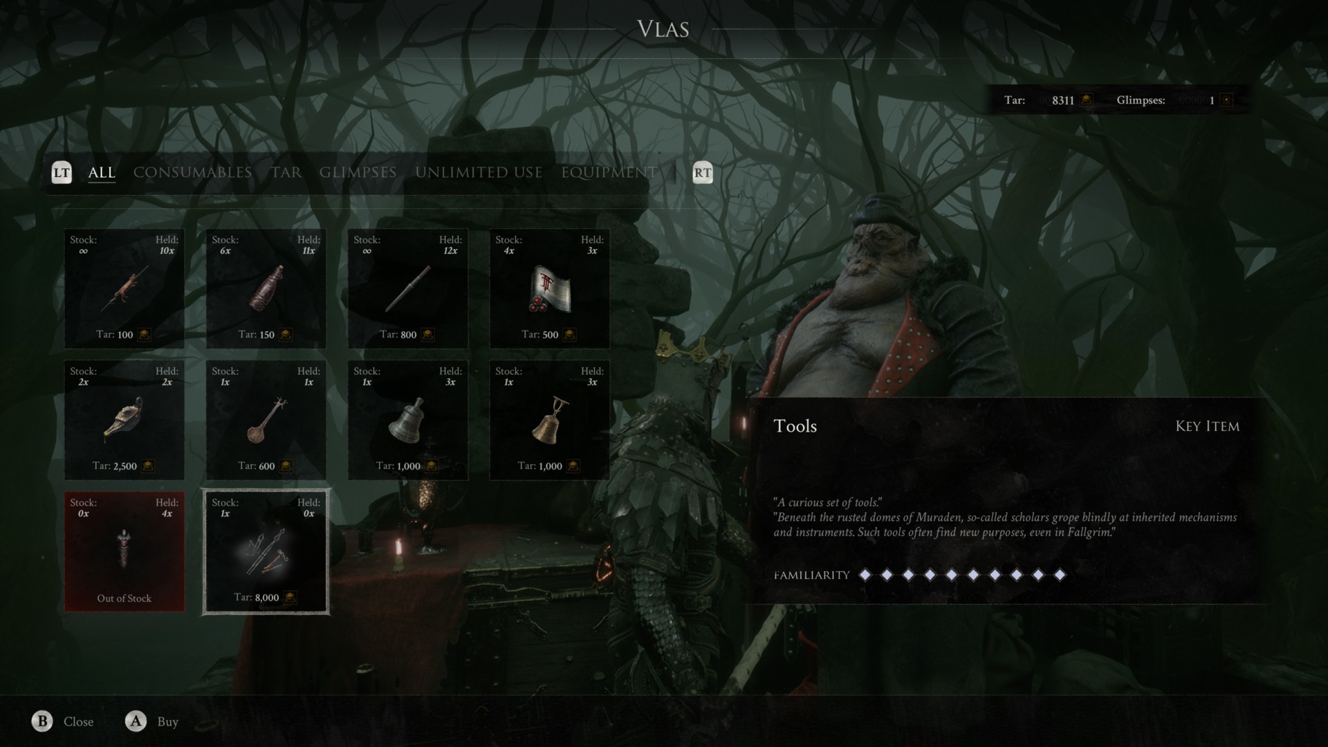 Keep in mind that buying items will cost either tar or glimpses. The former is regularly obtained when you kill enemies, whereas the latter is a rare drop. Some consumables you find will also give you varying amounts of tar or glimpse — i.e., Bag of Tar, Congealed Tar, Glimpse of Futility, Glimpse of Affection, and the like.