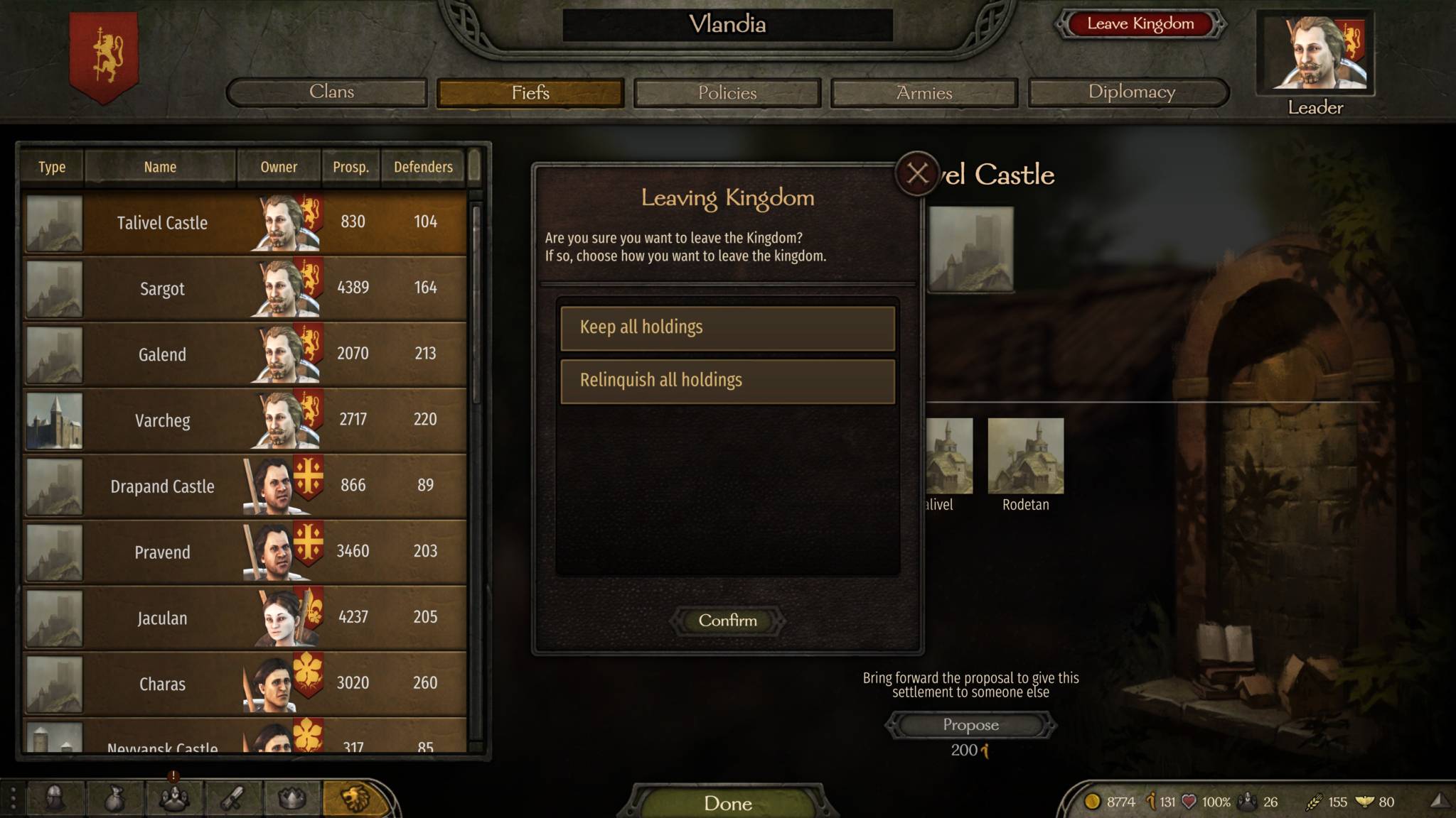 There’s also the “leave kingdom” option in the Kingdom panel which presents two options: