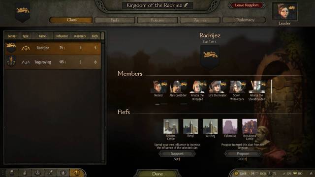 Let’s say you’re already gaining +40 to 70 influence per day. You could definitely spare some. As you can see in the Kingdom -> Clans panel above, you can choose to “support” a vassal clan so that it gains a small amount of influence. Likewise, this action also increases your relations by +2 points.