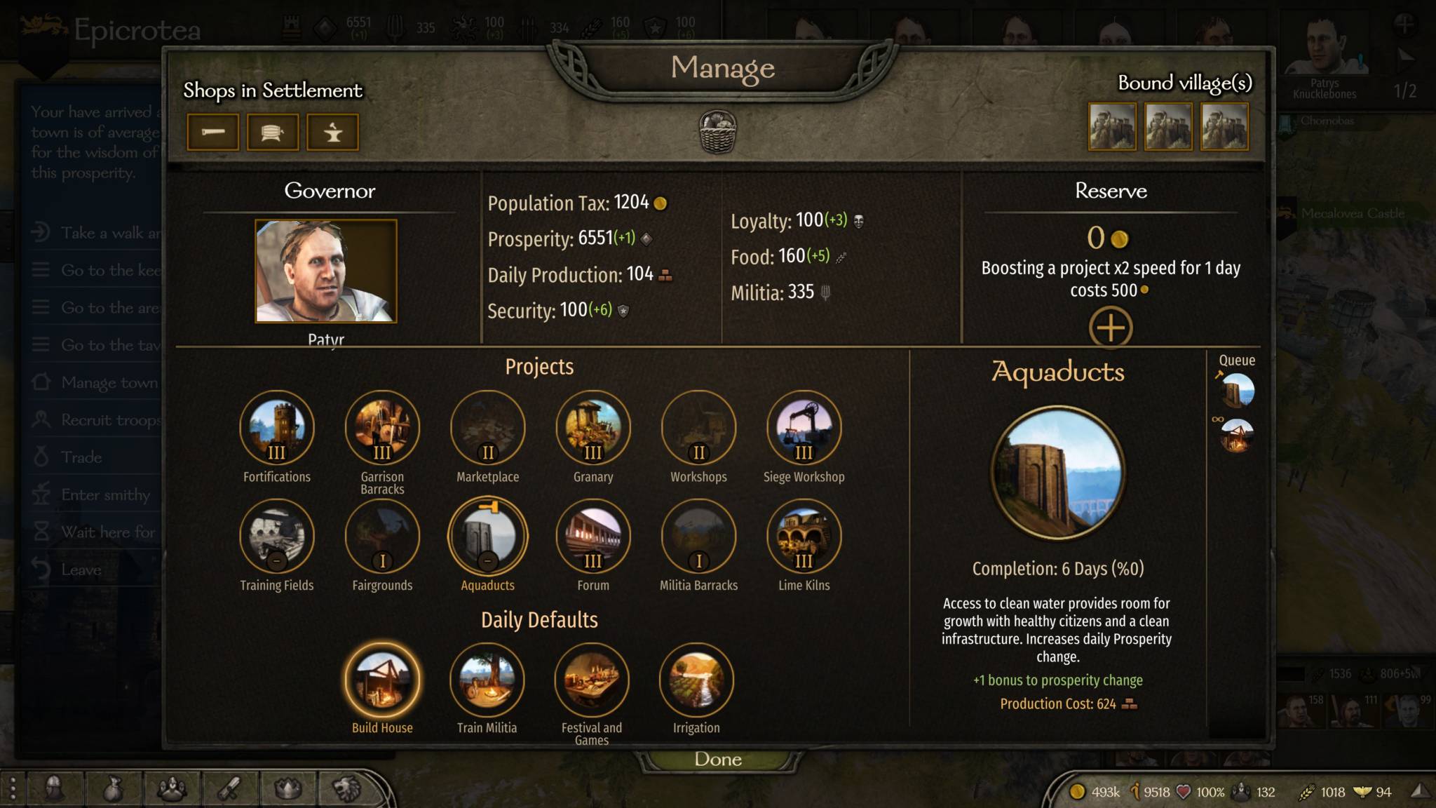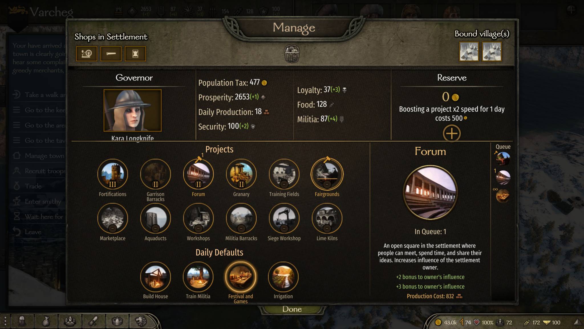 You can also construct buildings and start projects. For buildings, prioritize those that increase influence, settlement prosperity, and additional militia units. For projects, these repeat indefinitely, so just select the “build house” option to ensure that prosperity continues to rise. Lastly, try to complete the quests from NPCs to help boost your relations in the area.