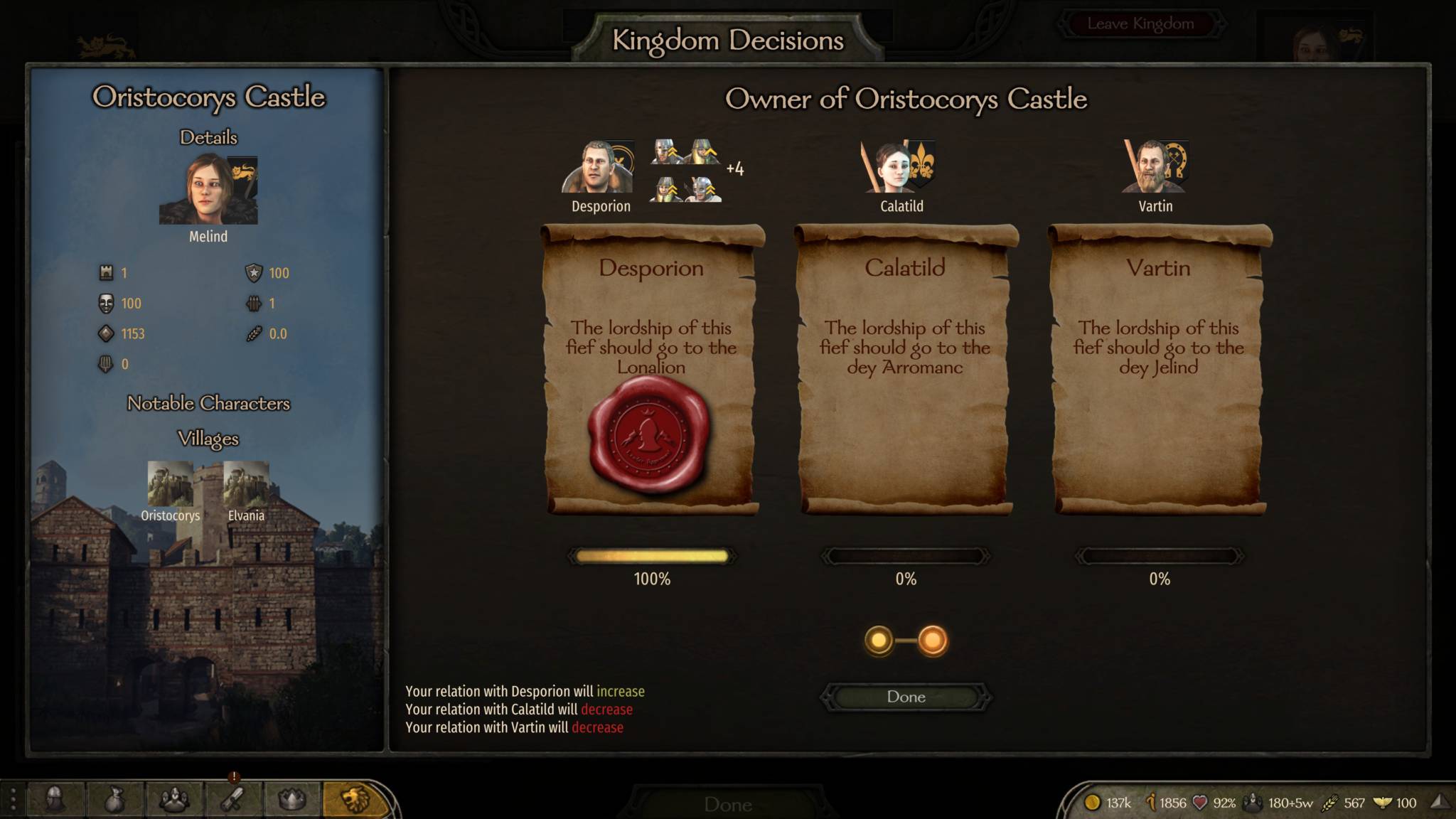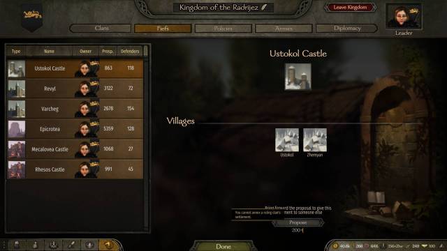 If you kept the settlement for yourself — or if you already had a settlement before your vassals joined — you can’t hand it over to them. If you go to the Kingdom -> Fiefs panel, the “propose” button simply won’t let you: