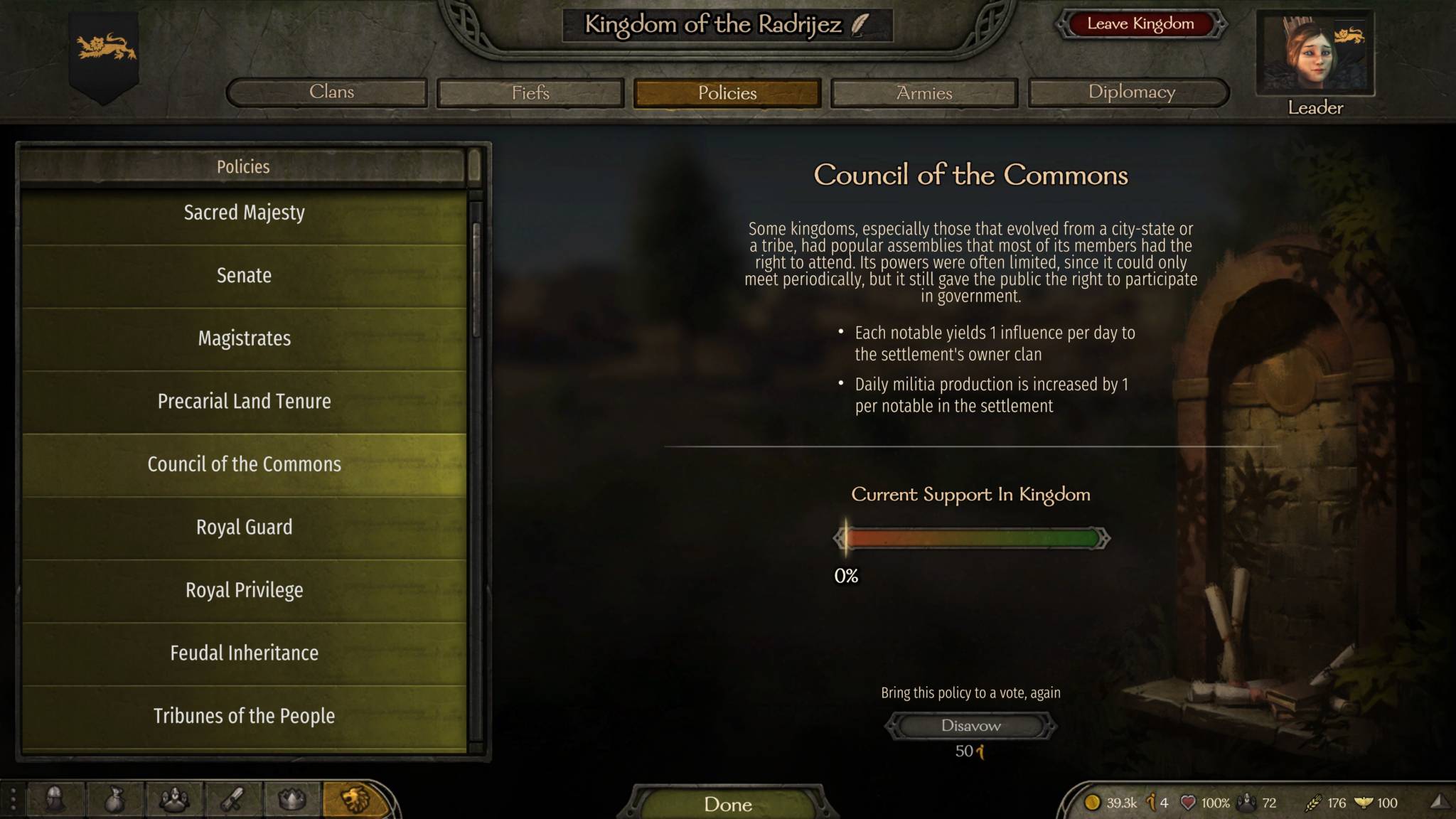 - Royal Guard – ruler clan gains +1 influence and +80 ruler’s party size; non-ruler clans lose 0.2 influence.
