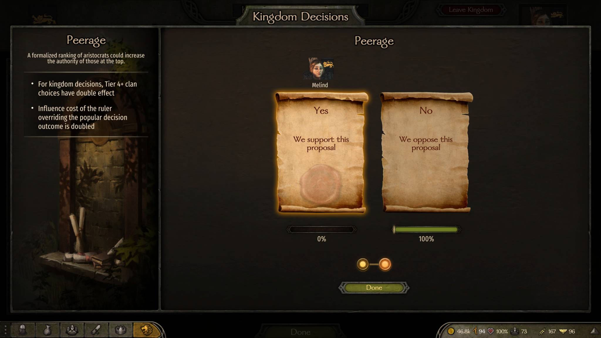 - Peerage – tier 4 clan choices have doubled effects; influence cost of ruler overriding popular decision is doubled – the x2 effects don’t seem to work when combined with Noble Retinues.