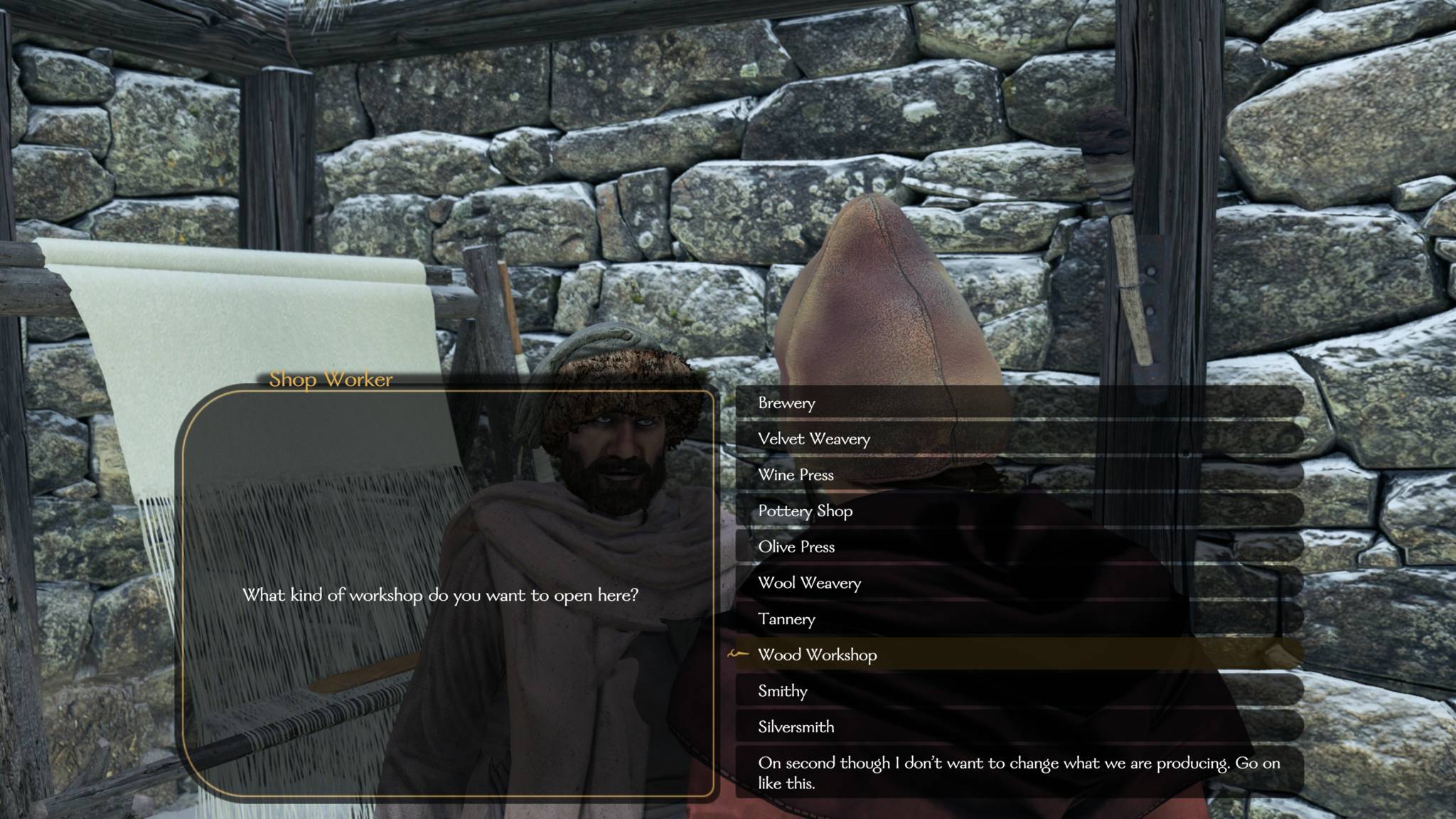 To open a workshop, visit a city and hold the “Alt” key. This will show the names of various characters and landmarks. You’ll then see places of interest such as a Wine Press, Linen Weavery, and the like. Make your way to any of these locations and speak to a shop worker NPC. If you have the gold (roughly 13,000), you’ll be allowed to select from various types of workshops. It’ll cost you 2,000 gold if you want to change the workshop’s type later on.