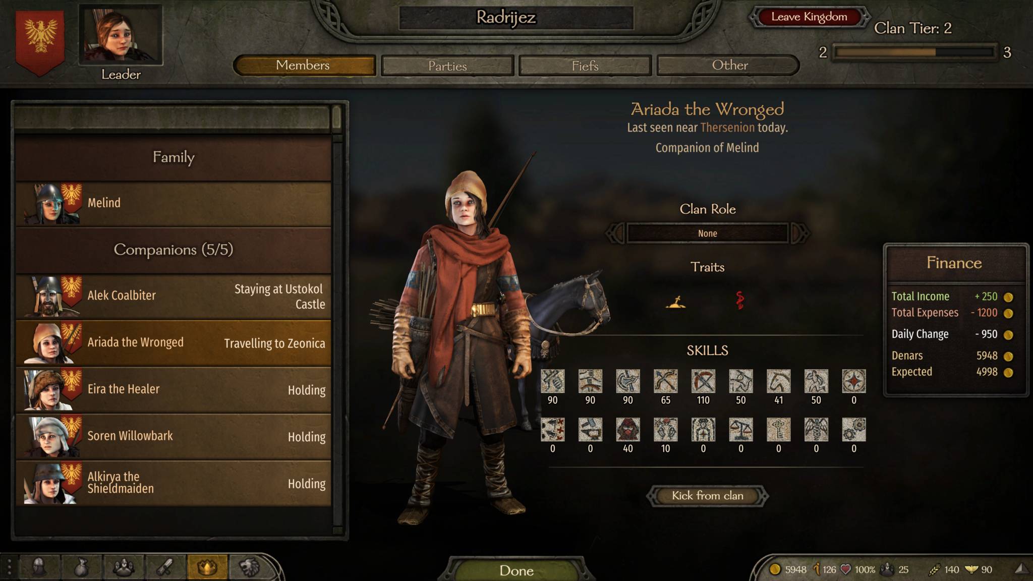 In the panel for parties, you can create another group led by a companion who’ll follow you around as part of your army. Your companion gets new recruits, but you’ll also incur higher upkeep due to having to pay additional troops. If you decide to disband your companion’s party, it won’t be instant. Your additional party will first travel to your nearest owned settlement before it fully disbands and allows your companion to rejoin you.