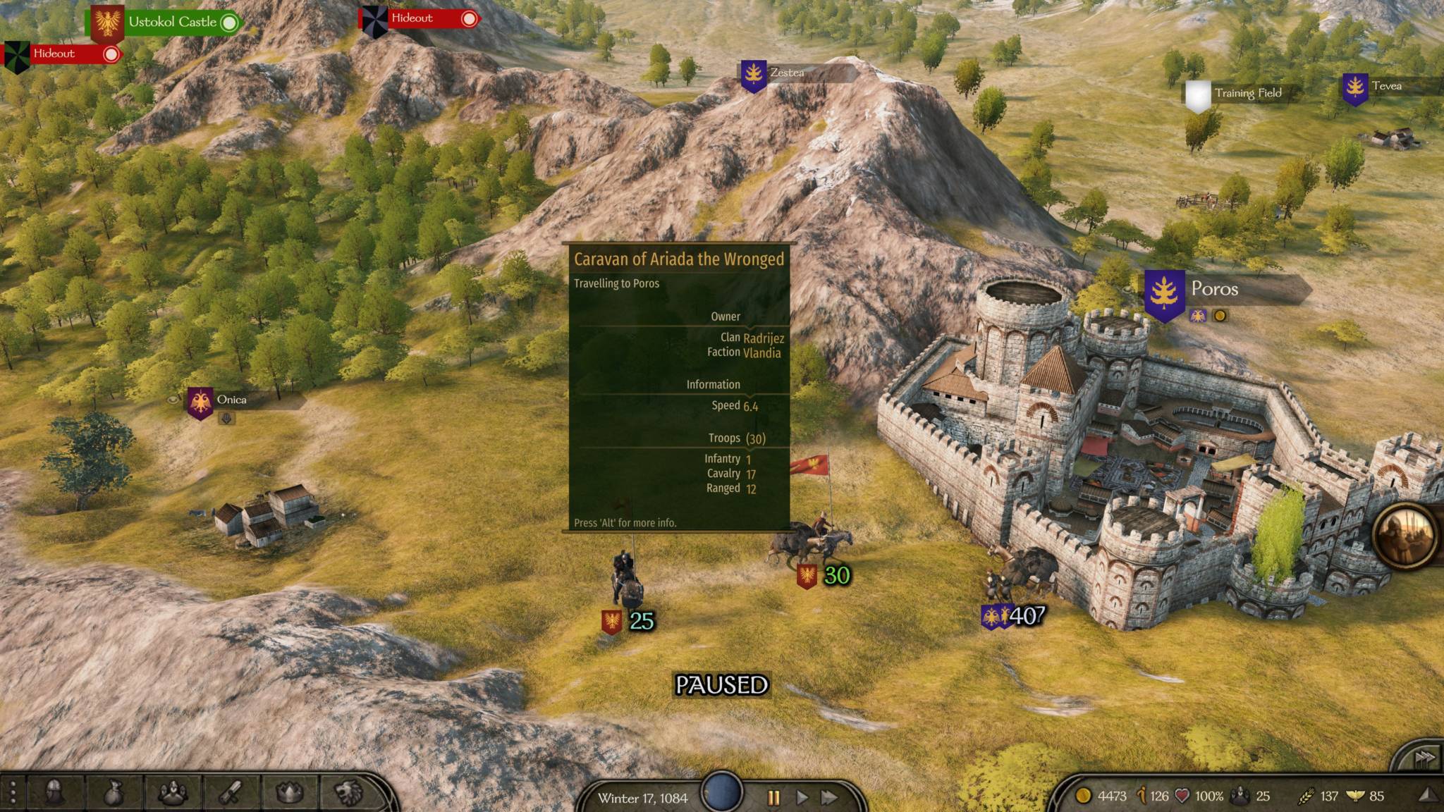 Do beware because caravans can get destroyed by bandits and hostile armies. Since Mount & Blade II: Bannerlord doesn’t have an “auto-follow” system, you’ll have to click on the caravan to babysit it while it’s traveling on the world map. However, if you’re too slow or the caravan enters a settlement, it’s possible to lose sight of it. Still, you can track where your caravan is by checking your clan menu -> parties.