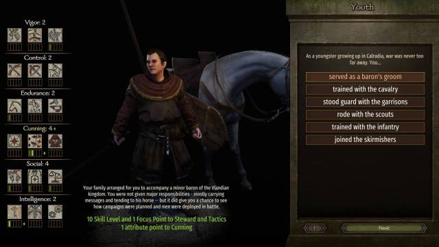 - Likewise, if you wish for your character to start with a high enough Steward skill for the quartermaster role, you could do that based on the backgrounds chosen during the character creation process in Mount & Blade II: Bannerlord.