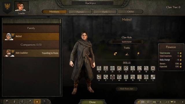 - Your character and companions can be assigned as the quartermaster via the clan screen (L); you can see this in the image above.