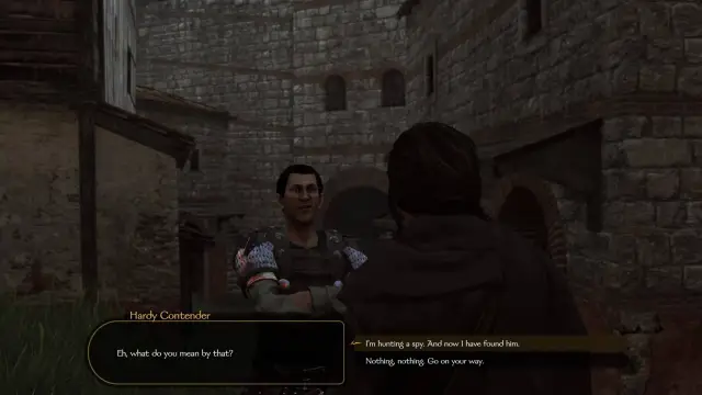 Eventually, though, a random NPC might give you a clue and “The Spy Ring” quest will be updated. In my case, I was told that the spy (who’s an arena fighter) also has a sword. Looks like I found him, surrounded by his goons, in an alleyway: