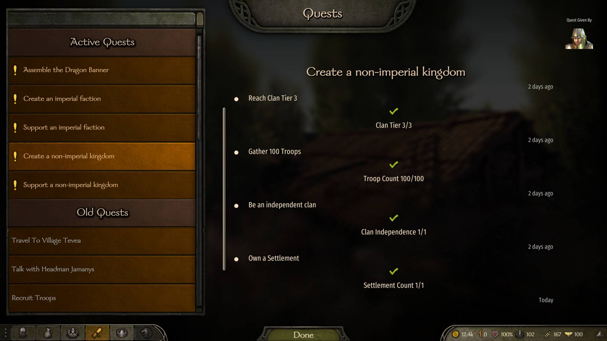- Option 1: Create a non-imperial kingdom – be at clan rank 3, have 100 troops, be an independent clan, and own a settlement