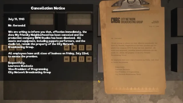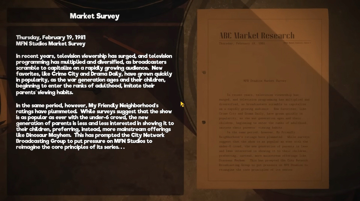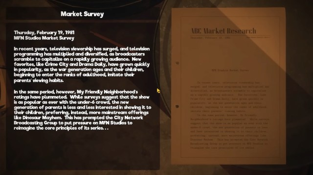 Through notes found in the game, as most horror loves to do, the timeline and world building is pieced together. My Friendly Neighborhood was originally conceived in the 1960s by a man named Al Gerzwald as Ricky with Friends. The first episode aired on public access in 1968 and the show was beloved by audiences. It was picked up by the City Network Broadcasting Group, changing the show to its current name and relocating production to its hotel. Alas, despite years of episodes and even movie productions, its popularity gradually changed due to a world-shattering event.