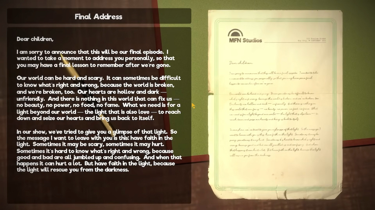 Near the end of the game, you can find a note from Al Gerzwald himself about the cancellation of the show. In the most haunting text I have ever read in a horror game note, he writes that “the world is broken, and we’re broken, too. Our hearts are hollow and dark—unfriendly. And there is nothing in this world that can fix us; no beauty, no power, no food, no fame.” But he goes on to say, “What we need is for a light beyond our world—the light that is also love—to reach down and seize our hearts and bring us back to itself. In our show, we’ve tried to give you a glimpse of that light.”