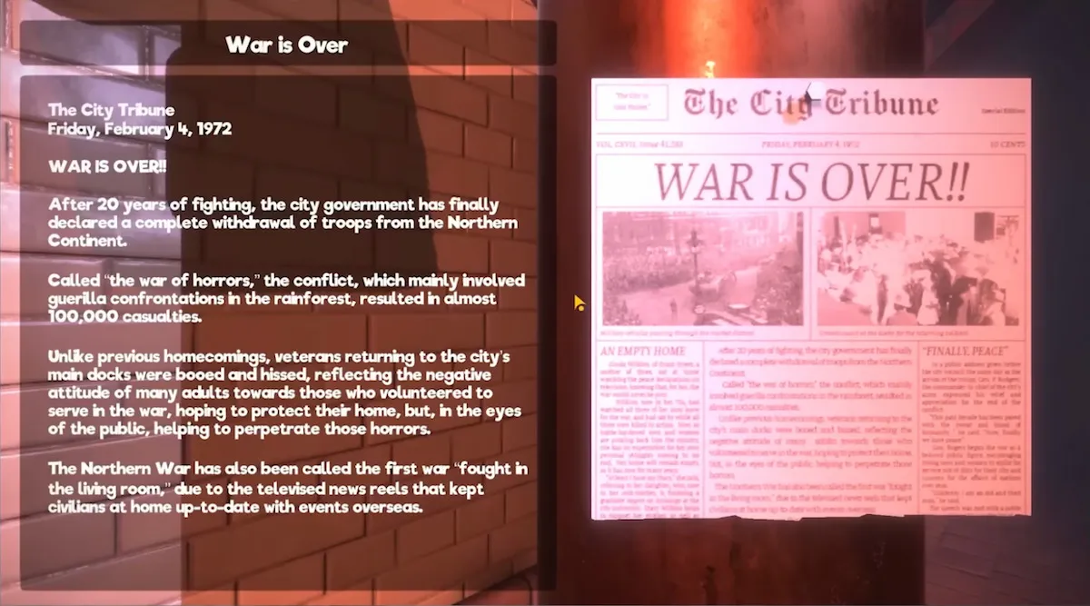 As we learn about in notes through the game, in this universe a war occurred on the northern continent, aptly named The Northern War. Referred to as ‘the war of horrors,’ this conflict, described as mostly guerilla warfare in the rainforest, went on for 20 years, from 1952 to 1972, the death toll ending up at almost 100,000. It was the first war to be widely broadcasted to the people at home. As a result, veterans coming home were demeaned for volunteering, seen as keeping its horrors going.