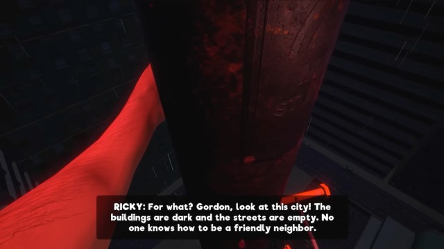 The most basic premise of the story is simple enough. Puppets begin re-broadcasting their canceled show, called My Friendly Neighborhood, over the nightly news and disrupting it. You play as Gordon O’brian, a disgruntled and prickly middle-aged repairman on the verge of being fired. He’s sent to disconnect the signal from the broadcast tower before the end of his workday. Unfortunately, he has a horde of puppets and physical obstacles to deal with in order to achieve this objective.