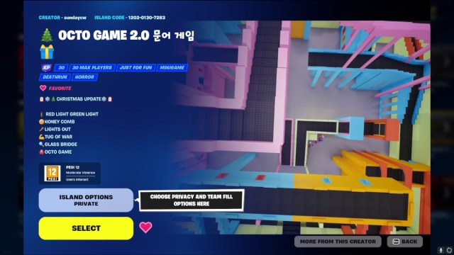 My favorite is Octo Game, a Fortnite twist on Squid Game, but it’s good to experiment.