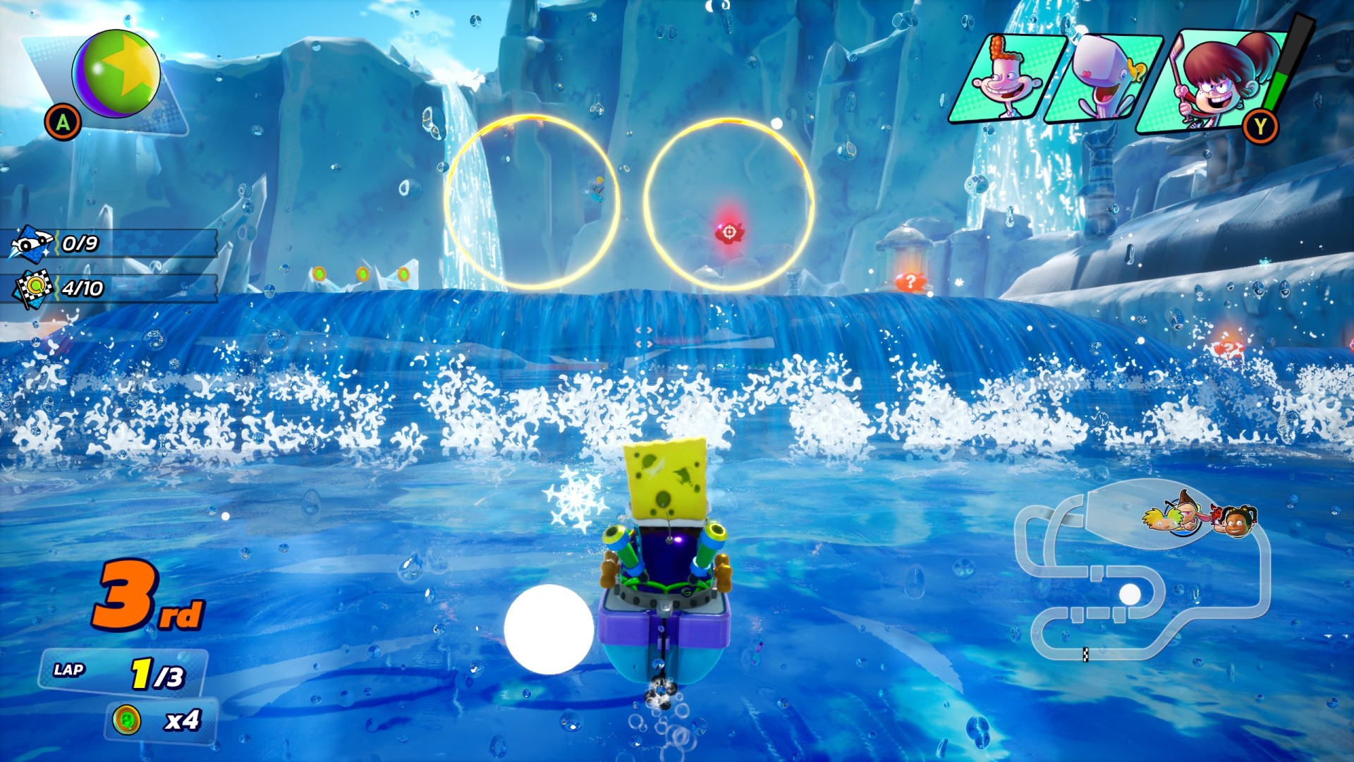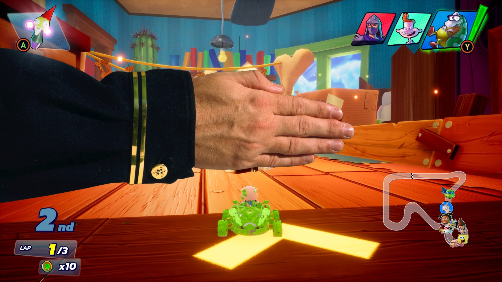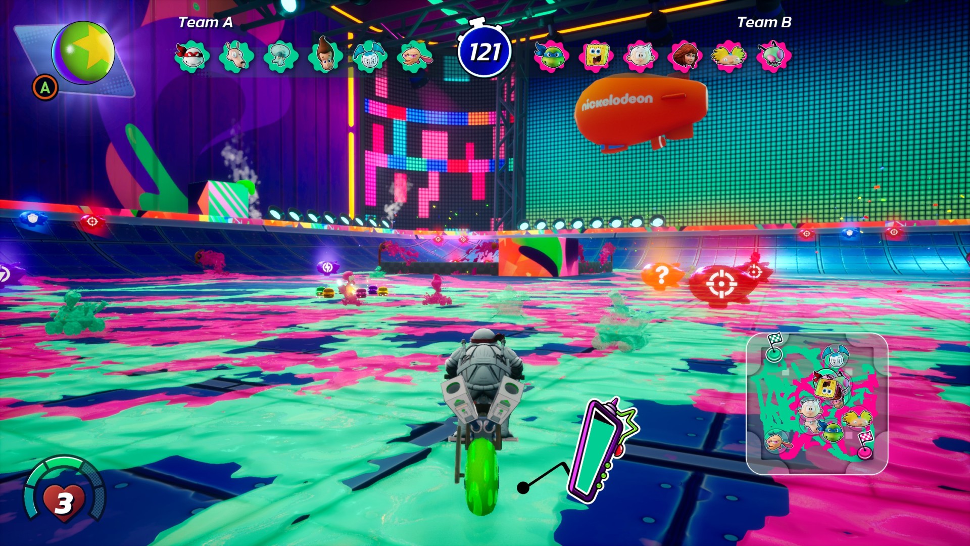 The kart racing itself is pretty darn good in Nickelodeon Kart Racers 3: Slime Speedway. The drifting can feel a bit off, but it’s better than I expected once you get a feel for the driving physics. If you drift for long enough, you’ll be able to boost when you let go, just like other kart racers. Orange Nickelodeon blimps line the tracks and give you your items when ran over. Everything here is mostly a different version of the items in other kart racers. The one I hate the most is Hans from SpongeBob which works kind of like the Mario Kart squid, except it blocks you from seeing what’s in front of you. I really can’t stand that arm.