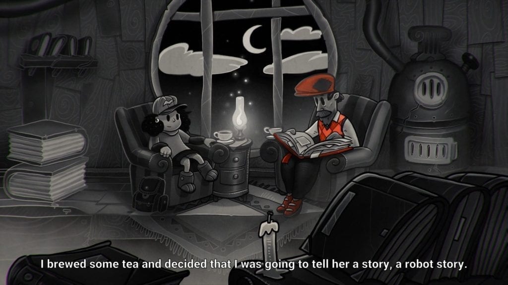 Yes, it is a video game about the Holocaust, whimsically told and framed from a child’s point of view. Some might scoff at the very idea, thinking that it makes light of the suffering of millions during World War II, but I disagree. Even at the very beginning, the old man (voiced by Patrick Stewart) tells a young child that he will tell her “a story about robots.”