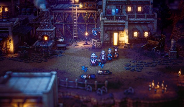 Although there are several of Octopath Traveler 2‘s NPCs patrolling at night you only need to knock out three of them to complete Reaching for the Stars. The three NPCs you need to knock out are the two villagers standing in front of the inn and the soldier to the left of them next to the stairs.