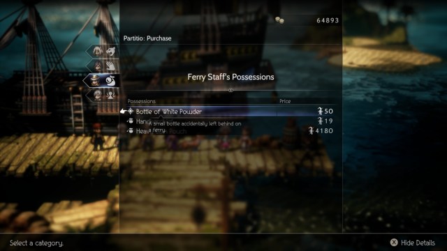 Upon arriving in Tota’haha, there will be a Ferry Staff member on your immediate right on the dock next to the large ship. Speaking to her will reveal that she found a bottle of white dust on the ferry. This is Young Traveler’s lost item. You can buy the Bottle of White Powder from the Ferry Staff member Partitio’s Purchase or take it with Osvald’s Mug or Throne’s Steal Path Action.